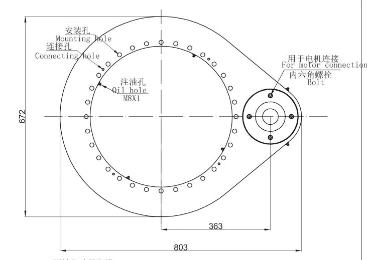 Lubrication of slewing drive; 4 M8X1 grease nipples on the inner ring; 2 M8X1 grease nipples on the housing; Slewing drive supplied pre-lubricated.