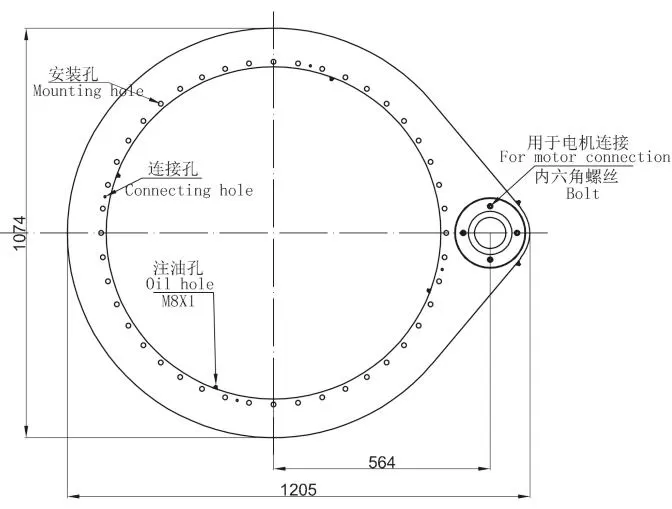 Lubrication of slewing drive; 4 M8X1 grease nipples on the inner ring; 2 M8X1 grease nipples on the housing; Slewing drive supplied pre-lubricated.