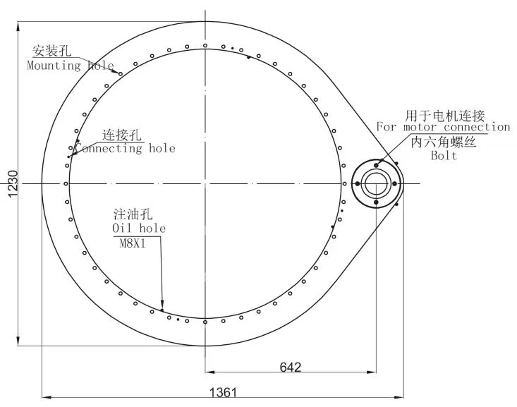 Lubrication of slewing drive; 4 M8X1 grease nipples on the inner ring; 2 M8X1 grease nipples on the housing; Slewing drive supplied pre-lubricated.